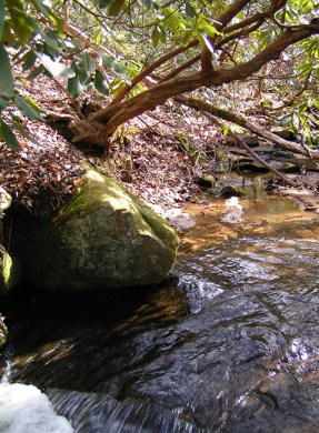 After carefully crossing the road, you will find a newer set of wooden steps that make it easy to get down onto the bridge. Getting down to Little Gap Creek, the body of water that runs beneath the bridge, may be a little tricky for those with mobility limitations or impractical footwear. The photo to the left shows the upper half of the path that leads to the creek. You can see some exposed roots and rocks along the path. I think most people could navigate it easily but it’s worth mentioning that tennis shoes or hiking boots are ideal.