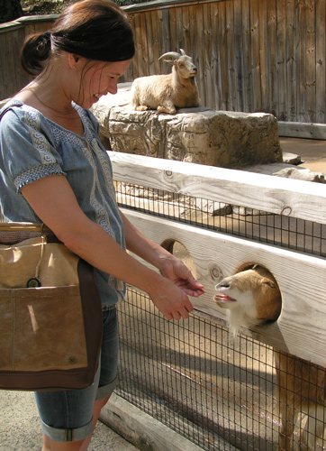 There are also several flamingos. The wind caused this one to have a bad feather day.FlamingoThe gators are a popular attraction.gatorsOur friend is feeding the goats using special crackers purchased at the zoo. The small barnyard area allows visitors to feed and pet several animals including goats, a pig, ducks, and chickens.