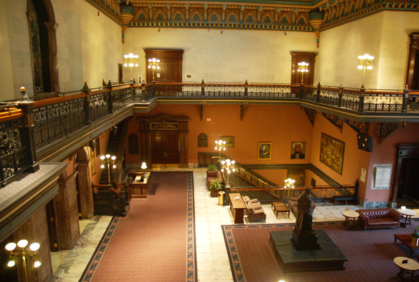 stained glass inside the state houseThe stained glass window is found inside the State House. It was constructed by a friend of architect Niernsee.