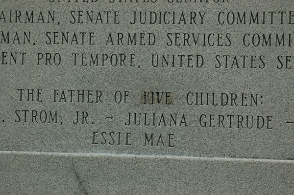 strom thurmon statueThis is a photo of the base of the Senator J. Strom Thurmond statue on the State House grounds. Strom was the oldest man to serve in the Senate and is well known for his racist politics and record-breaking filibuster against the Civil Rights Act in 1957. As you can see, the statue was placed before it was revealed that Strom’s oldest child was actually Essie Mae Washington-Williams who was conceived after a liaison between a young Strom and his parent’s African American maid.
