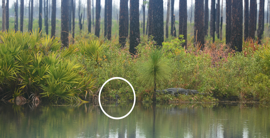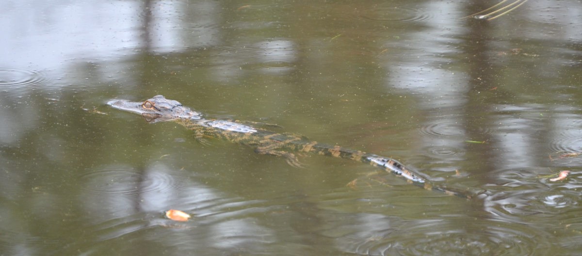 This juvenile gator was chirping as he enjoyed his morning swim. Between the sprinkles and his frenzied swimming, it was a bit difficult to get a good photo. This was one of those experiences that makes for better memories than photos.