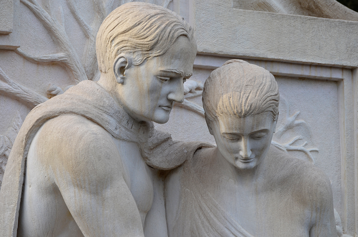 This monument stands away from the water on a shady path.