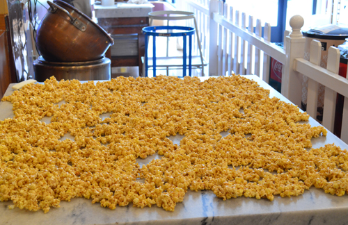 White chocolate popcorn is made fresh in the store. It’s cooling on the marble slab. The employees are always sharing free samples of some sort of delicious treat.