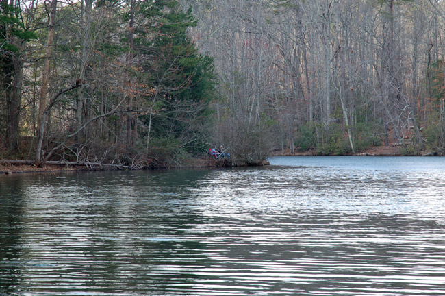 These gents seemed to be having a good time fishing. I happened across a dad and his preschooler on the other side of the lake. They were picnicking (pizza) and fishing. The little boy had caught his first bass earlier that day and instead of becoming addicted to the thrill of the catch, he was done with fishing. He met his objective (catching the fish) and now other things (a cool tree stump) had his attention.